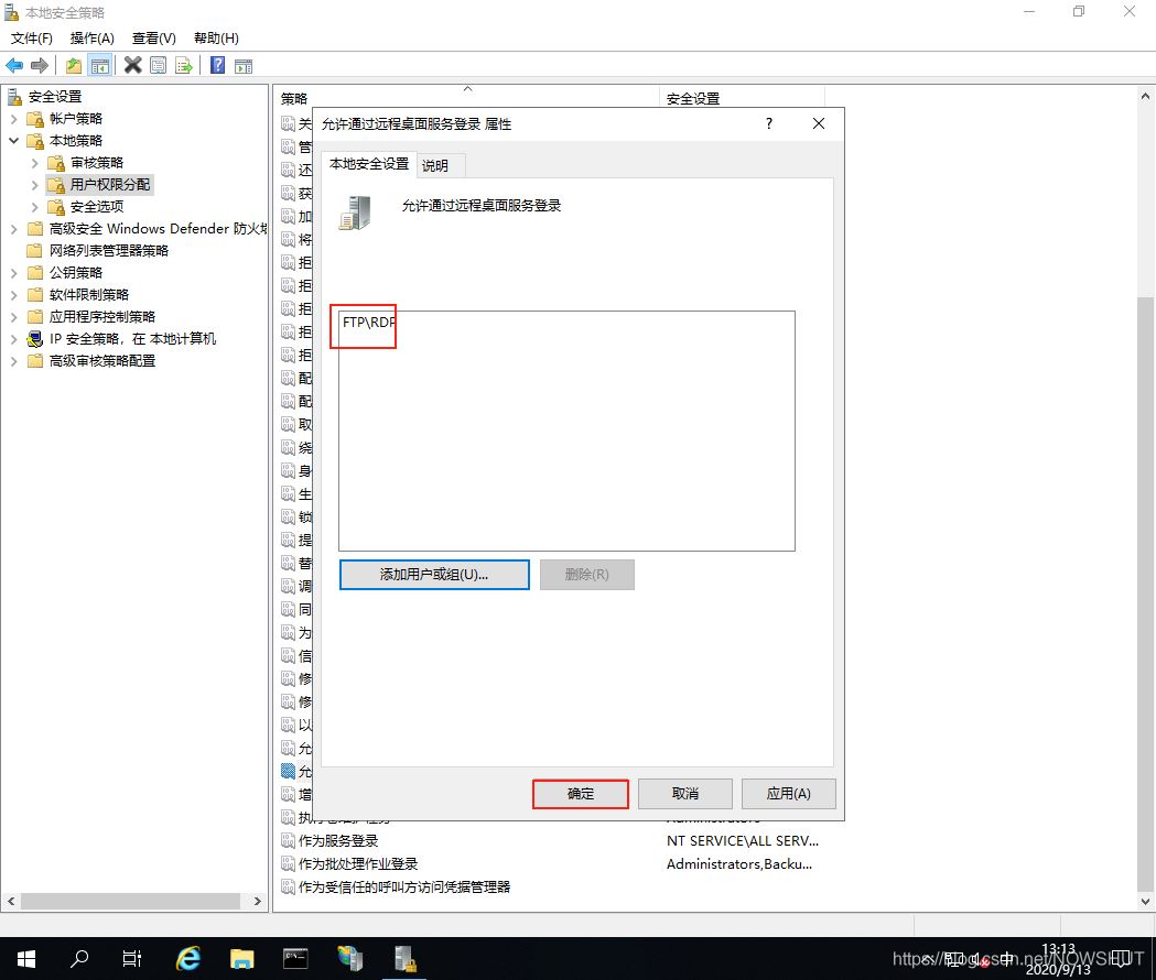 (6)返回【允許通過遠程桌面服務登錄 屬性】界面,可以看到RDP賬戶已經存在在列表中,最后點擊【確定】。