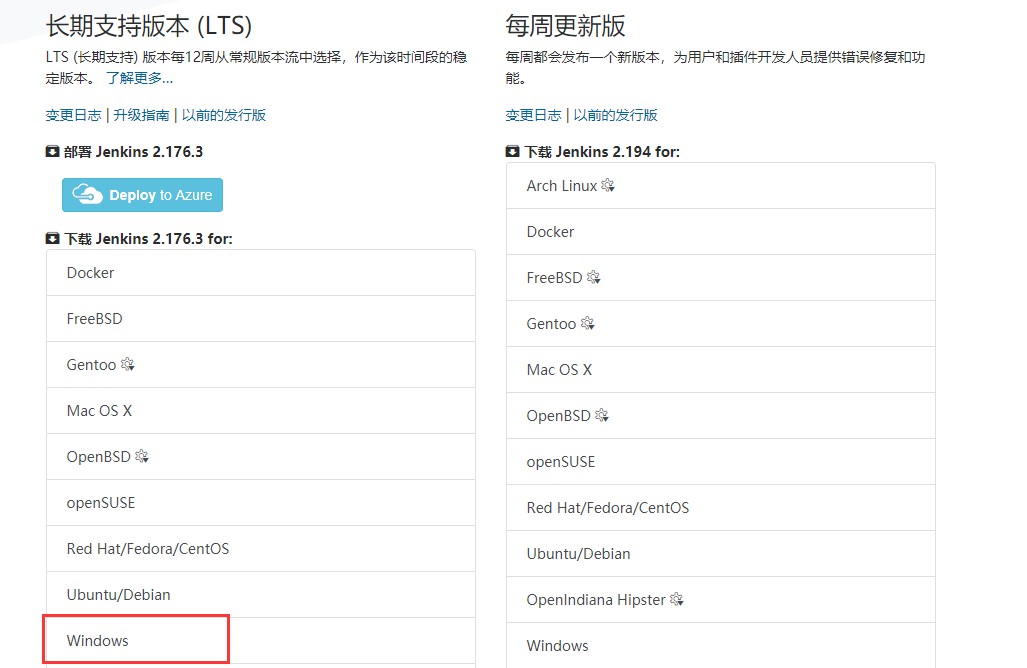 如圖所示。Jenkins分為兩個版本:長期支持版和每周更新版,這里選擇長期支持版下載,點擊“下載”會加載下載頁面