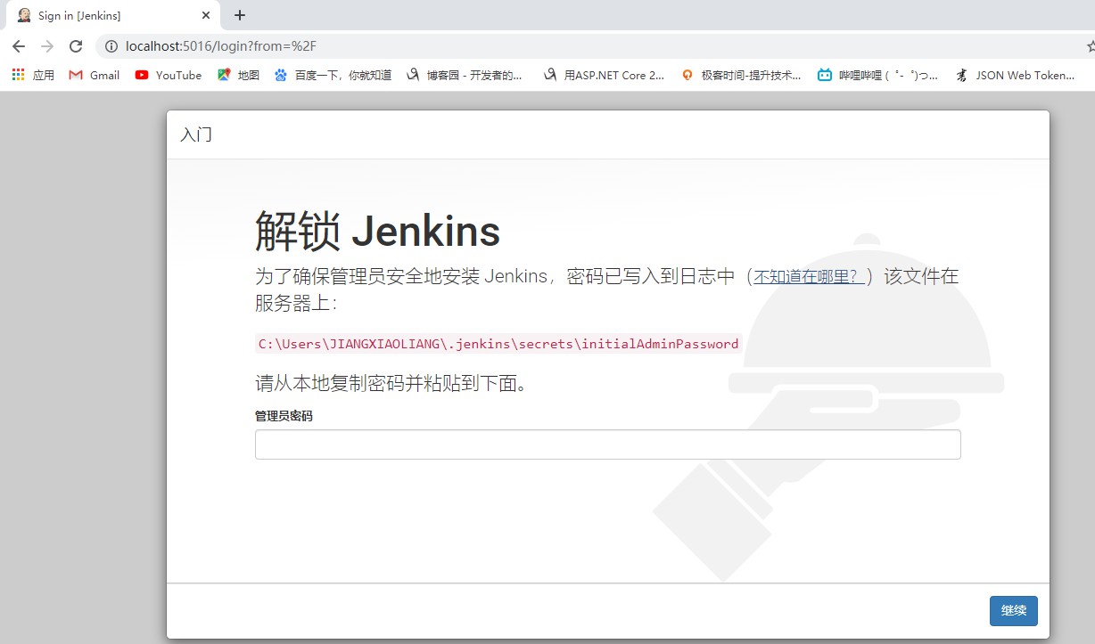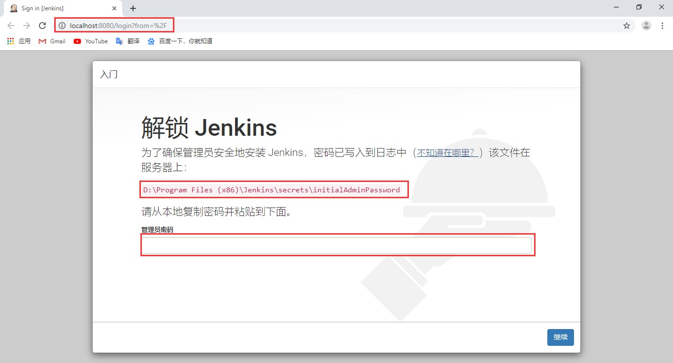 點擊“Finish”按鈕,瀏覽器會自動打開Jenkins默認的端口進行瀏覽,第一次登陸Jenkins的時候需要先進行解鎖,按照路徑提示找到密碼,可以使用任何文本編輯工具打開該文件,然后輸入管理嗎密碼解鎖: