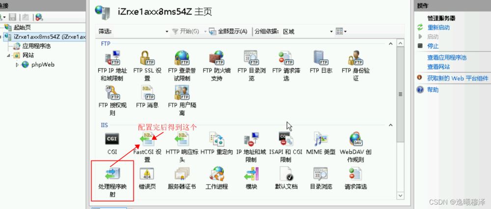 <?xml version="1.0" encoding="UTF-8"?><configuration> <system.webServer><rewrite> <rules><rule name="OrgPage" stopProcessing="true"><match url="^(.*)$" /><conditions logicalGrouping="MatchAll"><add input="{HTTP_HOST}" pattern="^(.*)$" /><add input="{REQUEST_FILENAME}" matchType="IsFile" negate="true" /><add input="{REQUEST_FILENAME}" matchType="IsDirectory" negate="true" /></conditions><action type="Rewrite" url="index.php/{R:1}" /></rule> </rules></rewrite><defaultDocument> <files><add value="index.php" /> </files></defaultDocument> </system.webServer></configuration>5、點(diǎn)擊網(wǎng)站下的網(wǎng)站目錄,右側(cè)有個(gè)瀏覽網(wǎng)站的 瀏覽 *.80(http) ,可以訪問你的站點(diǎn);