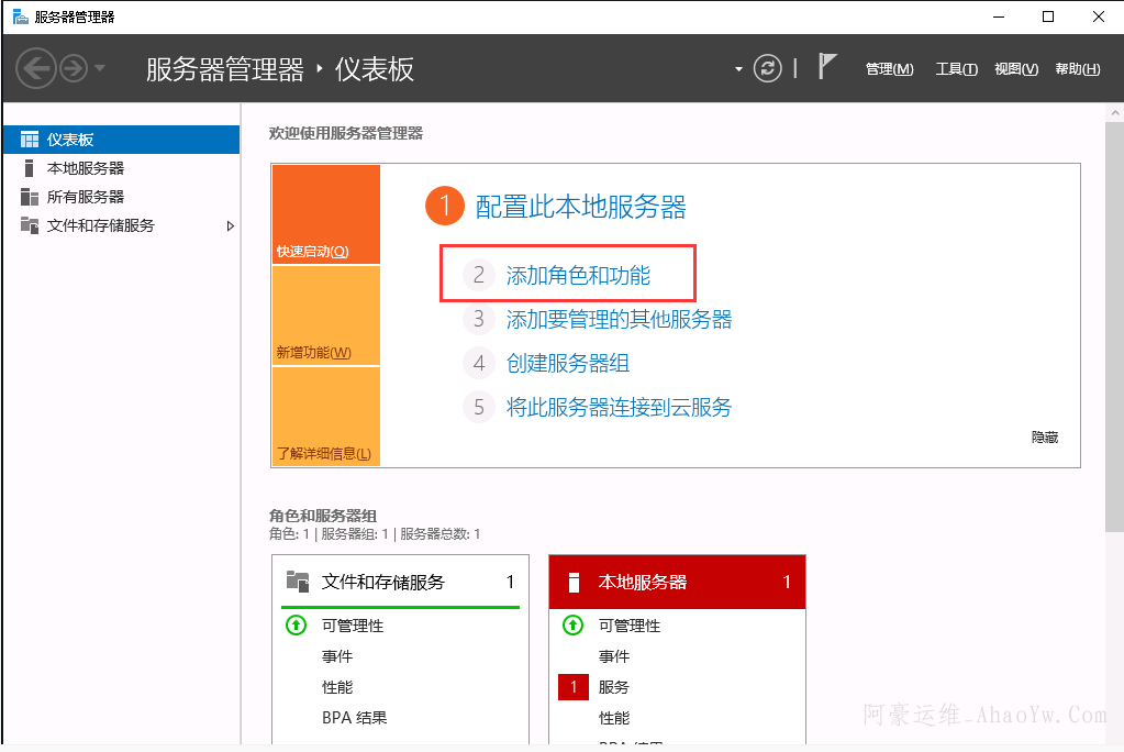 2、在彈出的服務器管理器界面找到添加角色和功能