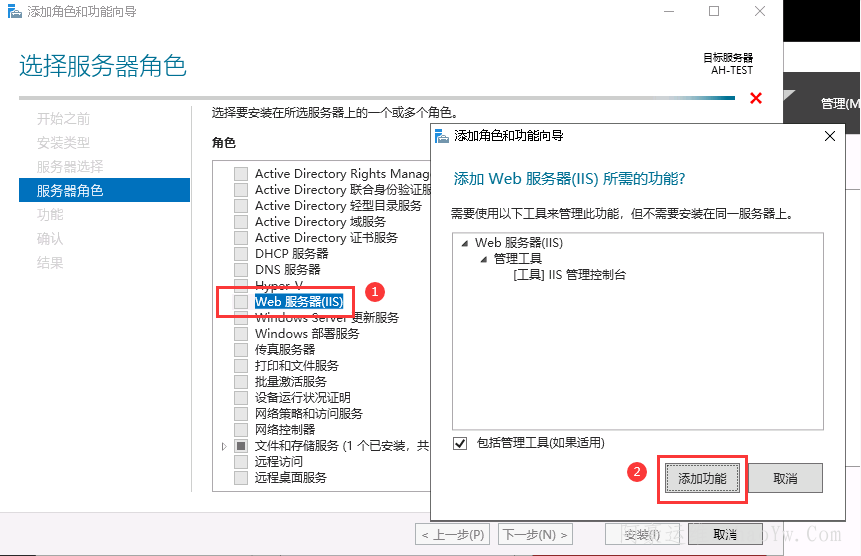 6、選擇:Web服務器(IIS),在彈出的對話框選擇添加功能