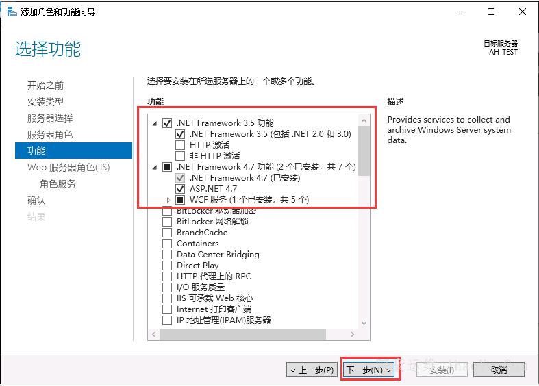 8、勾選NET功能,繼續點擊下一步(需要NET3.5和NET4.6就把NET3.5和NET4.6功能選項打鉤)