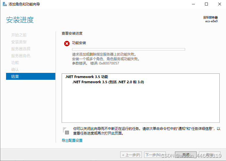 注:如果沒有依賴包,安裝報錯會提示(報錯如下圖):請求添加或刪除指定服務器上的功能失敗。安裝一個或多個角色,角色服務或功能失敗。參數(shù)錯誤。錯誤:0x80070057
