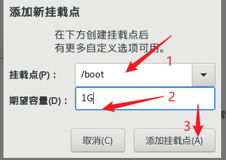 指定/boot 分區,即引導分區,大小為1G, 然后點擊添加掛載點.