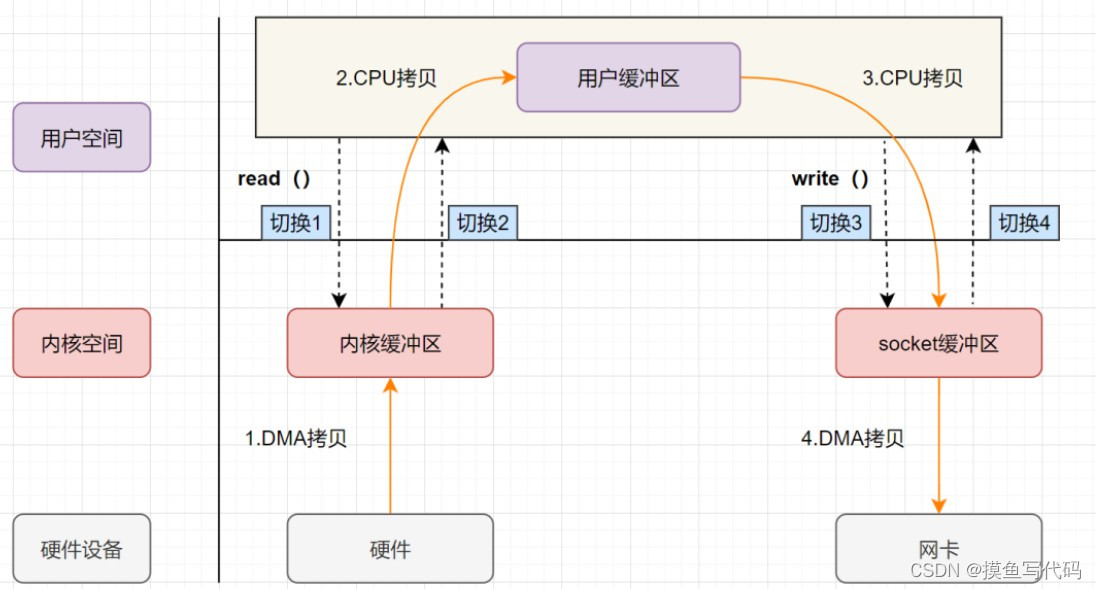如圖所示,傳統 io 的過程中,發生了4次空間切換 + 4次拷貝