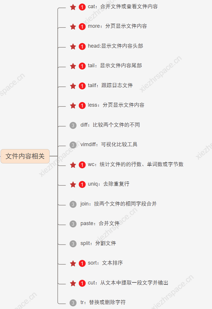 可以用來顯示單個文件內容 可以將幾個文件連接起來一起顯示 從標準輸入中讀取內容并顯示,與重定向或追加符號配合使用 功能 舉個栗子 查看文件內容 cat xiezhr.txt 查看xiezhr.txt 的內容 把多個文件合并成一個 cat xiezhr1.txt xiezhr2.txt >newxiezhr.txt 編輯或追加內容到文件尾部 cat >>xiezhr.txt<<EOF My blog is www.xiezhrspace.cn. EOF 清空文件內容 cat /dev/null >xiezhr.txt 命令可以把xiezhr.txt文件內容清空,但是文件還是存在的