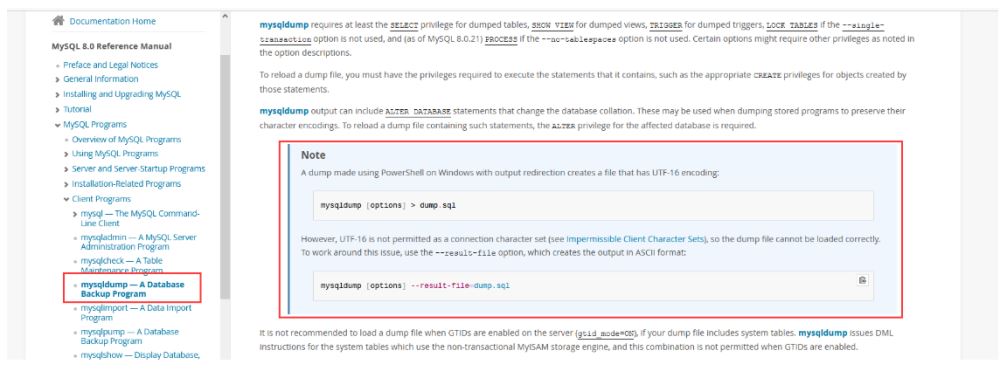 - 最后在MySQL官網找到一段 mysqldump 相關的說明,在這段代碼中找到了解決方案(https://dev.mysql.com/doc/refman/8.0/en/mysqldump.html)