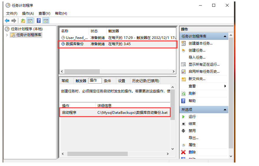 最后我們用 windows 的定時任務在每天凌晨三點的時候執行這個 bat 腳本,就能做到一天備份一次數據庫拉。