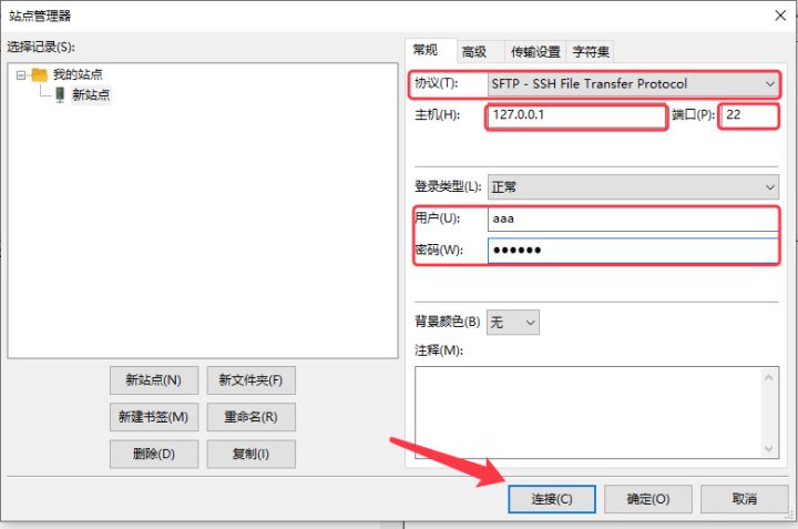 - 用戶名:為我們搭建sftp服務器時,創建用戶,本例為aaa