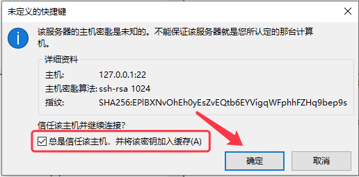 初次連接時,會提示是否信任該主機,打勾,并確認。