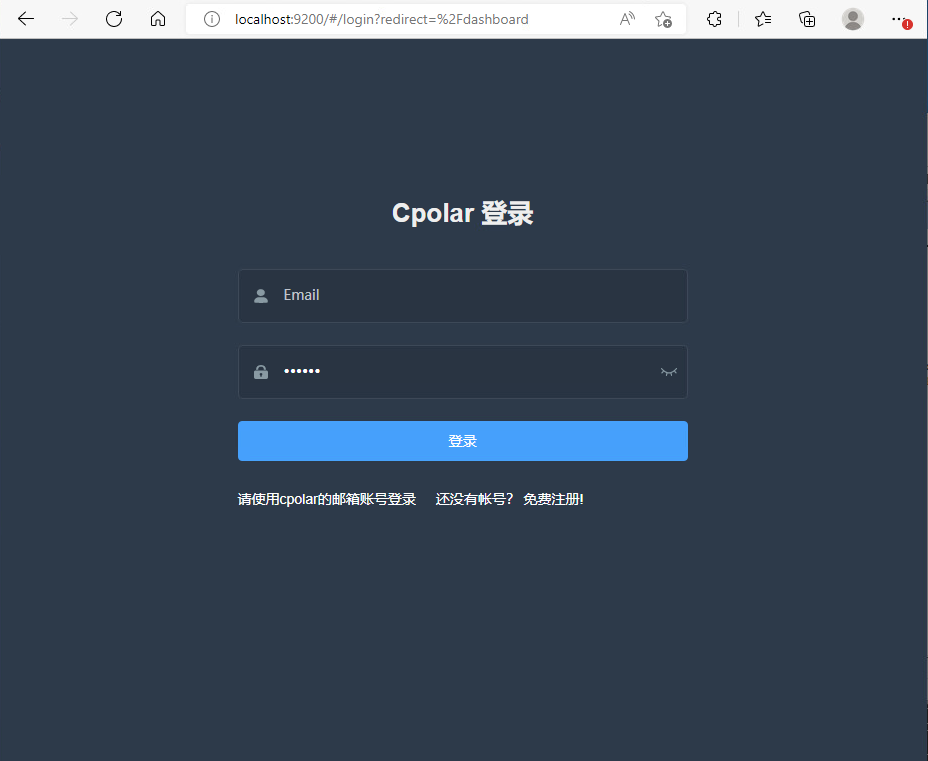 - cpolar安裝完成后,我們打開瀏覽器訪問127.0.0.1:9200,使用剛剛注冊的cpolar郵箱賬號登錄cpolar web ui管理界面