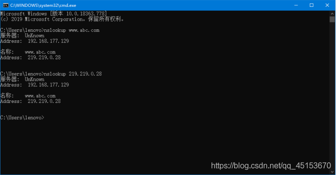 步驟7: 在本機cmd下分別輸入 nslookup www.abc.com 和 nslookup 219.219.0.28