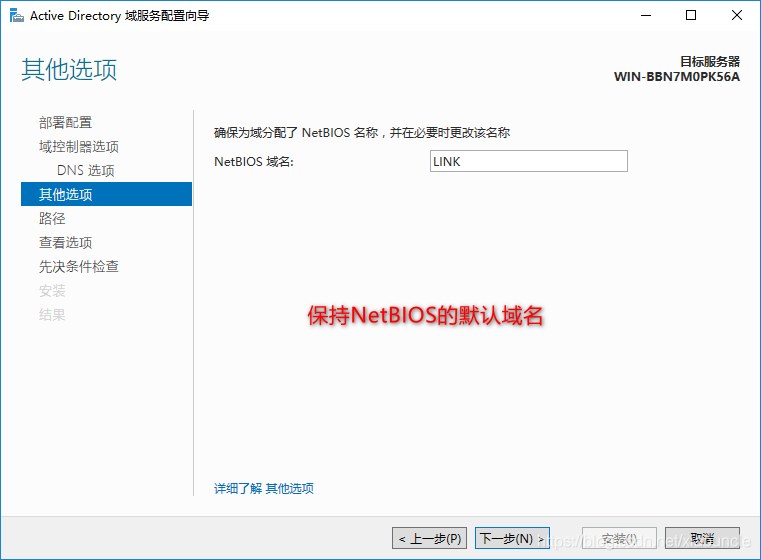 7、 保持NetBIOS的默認域名、默認存儲路徑,并開始安裝