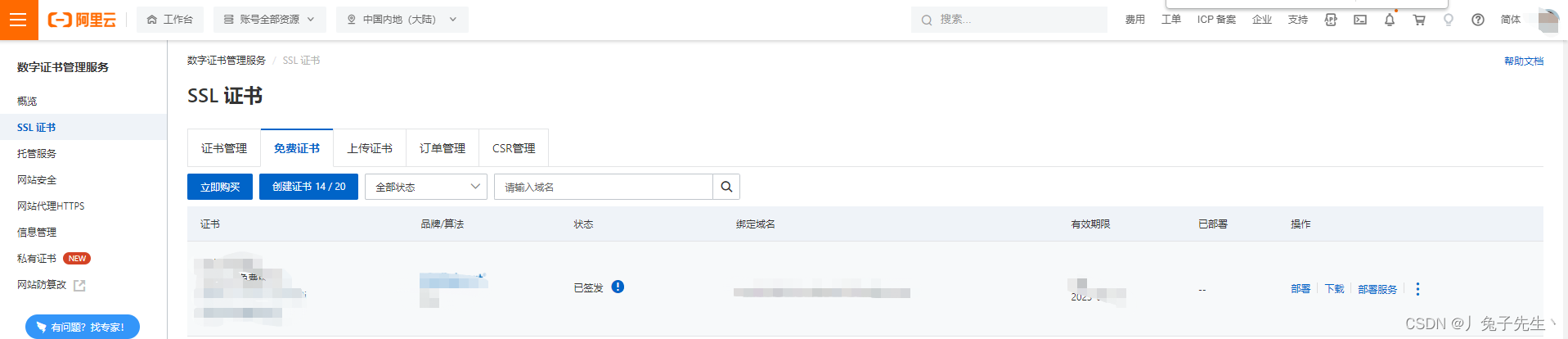 4)選擇“免費(fèi)證書”并創(chuàng)建證書提交申請(qǐng),審核通過后如下會(huì)有一個(gè)SSL證書