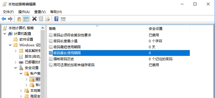 2、計算機配置 - Windows設置 - 安全設置 - 帳戶策略 - 密碼策略:”密碼最長使用期限”,設置為”0”(無期限)。