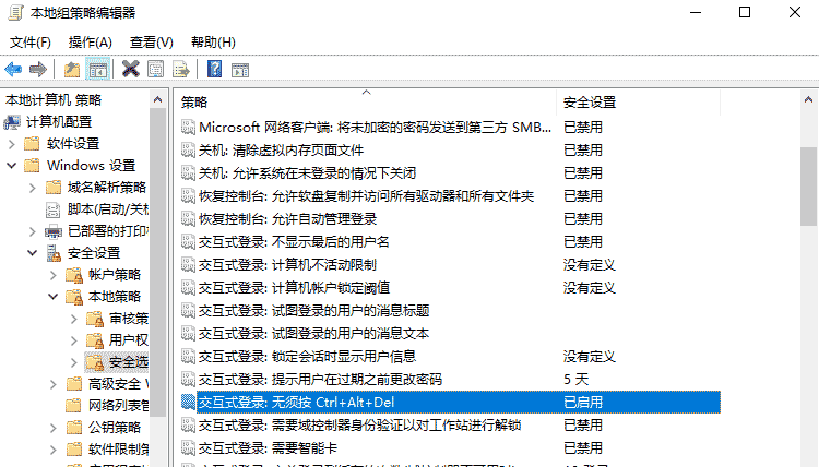 3、計算機配置 - Windows設置 - 安全設置 - 本地策略 - 密碼策略 - 安全選項,”無需按 Ctrl+Alt+Del”,設置為”已啟用”。