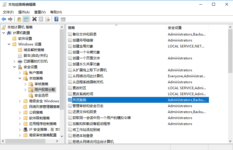 7、計算機配置 - Windows設置 - 安全設置 - 本地策略 - 用戶權限分配,“關閉系統設置為標準帳戶類型的用戶允許關機,重啟