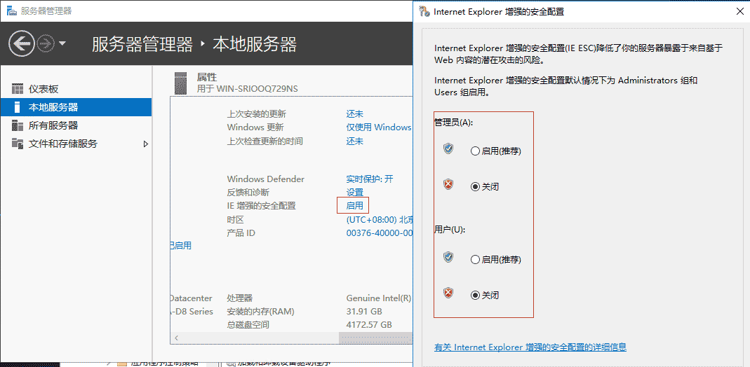 1、Server Manager,Internet Explorer增強的安全配置,”管理員”與”用戶”的下方,勾選”關閉”。