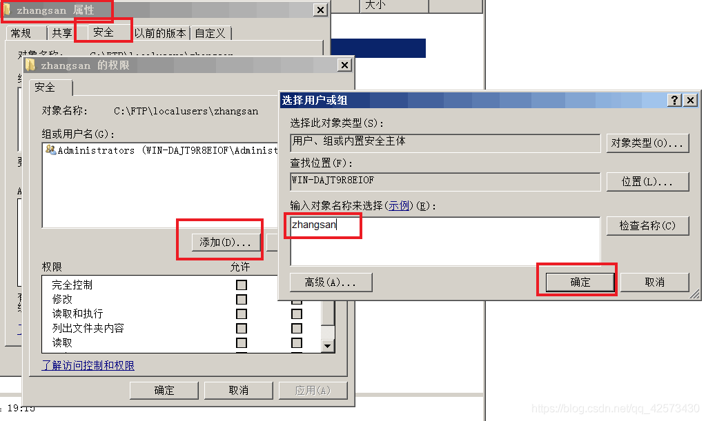 8.為文件夾zhangsan添加權限,右擊zhangsan文件夾,單擊屬性-安全-編輯-添加用戶zhangsan,用戶名一定要與文件夾名相同,單擊確定,權限勾選完全控制,用戶zhangsan登錄時只能查看看到文件夾zhangsan,在文件夾zhangsan里實現上傳和下載