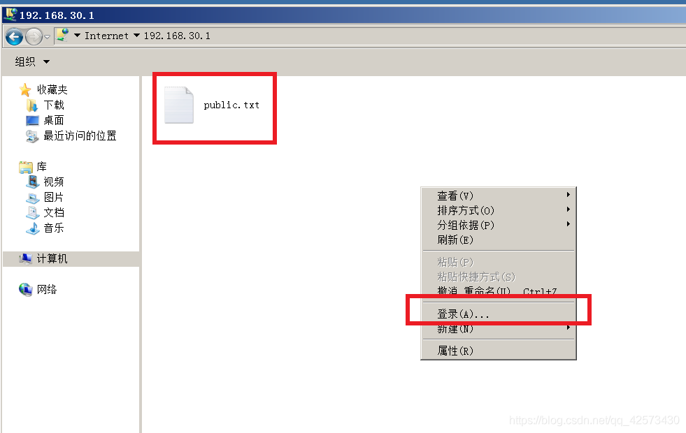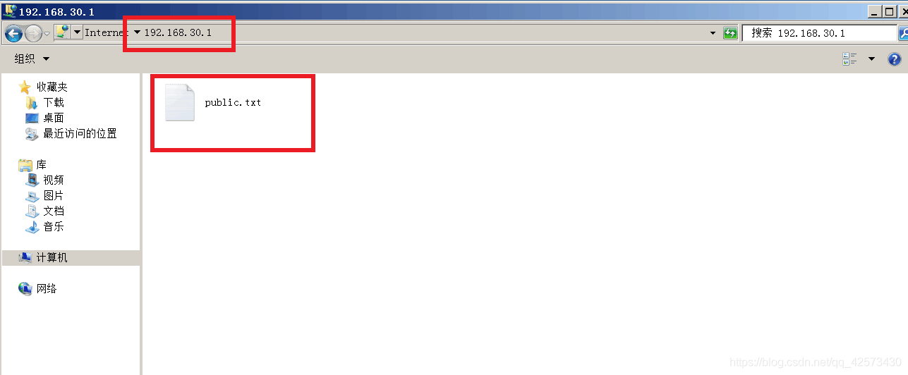 2.打開計算機,在搜索框輸入ftp://192.168.30.1 IP地址為FTP服務器的IP地址,匿名用戶登錄時只能登錄到public文件夾
