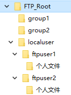 localuser內用戶文件夾名稱必須與上一步創建的FTP用戶名一致,否則無法登陸,另外兩個group文件夾用于設置虛擬目錄共享。