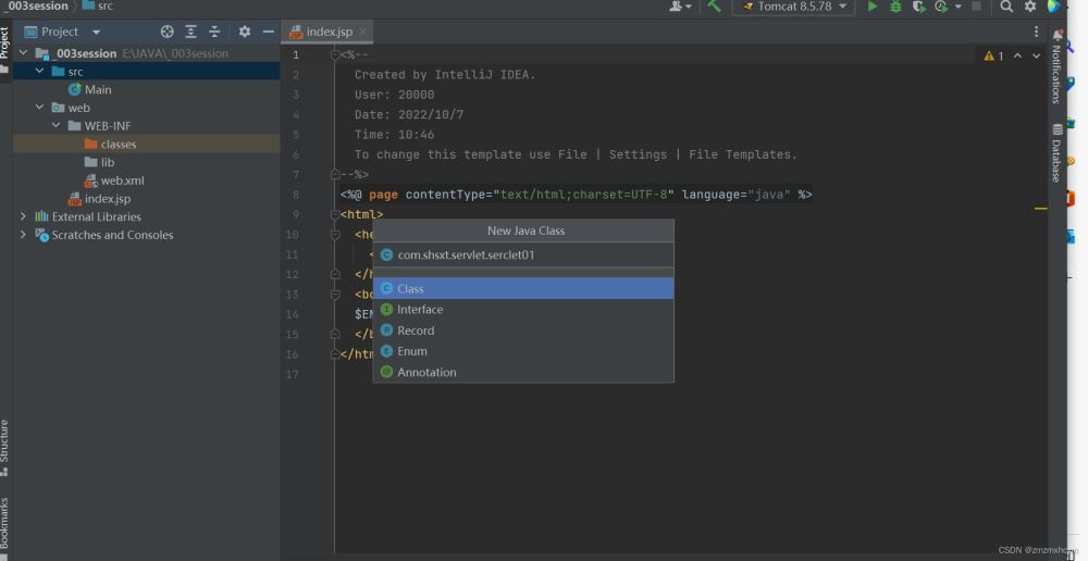 2.創建完成后按照下圖所示,依次選擇 File -> Add Framework Support -> Web Application -> 在WEB-INF文件夾下創建classes和lib文件夾