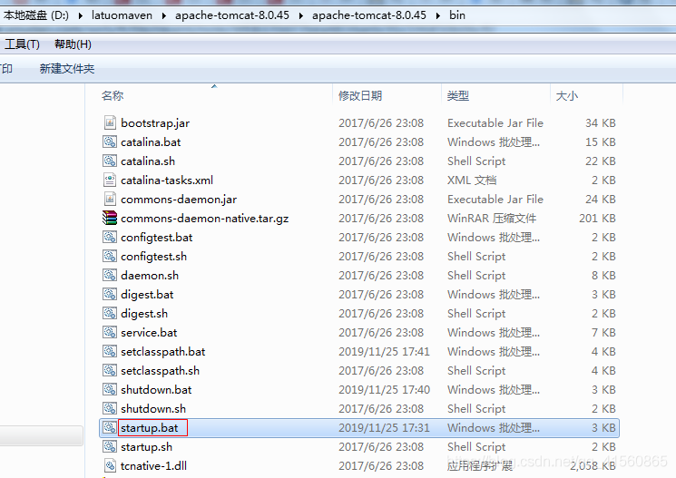 5、進入目錄$TOMCAT_HOME$ bin,點擊startup.bat, 啟動Tomcat服務器。(Linux系統點擊startup.sh)
