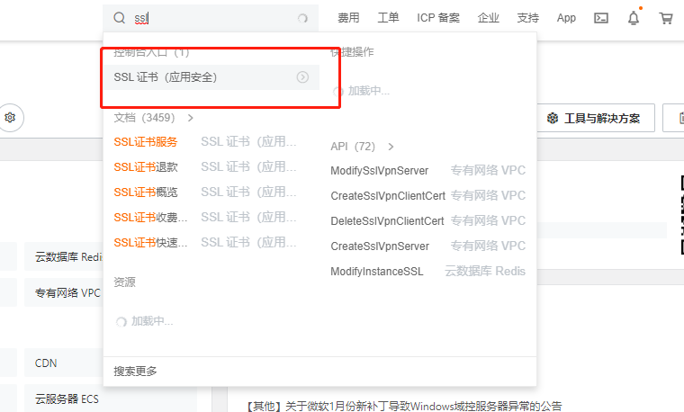 我就以我最常用的ssl證書為例,先登錄阿里云,進入控制臺搜索ssl