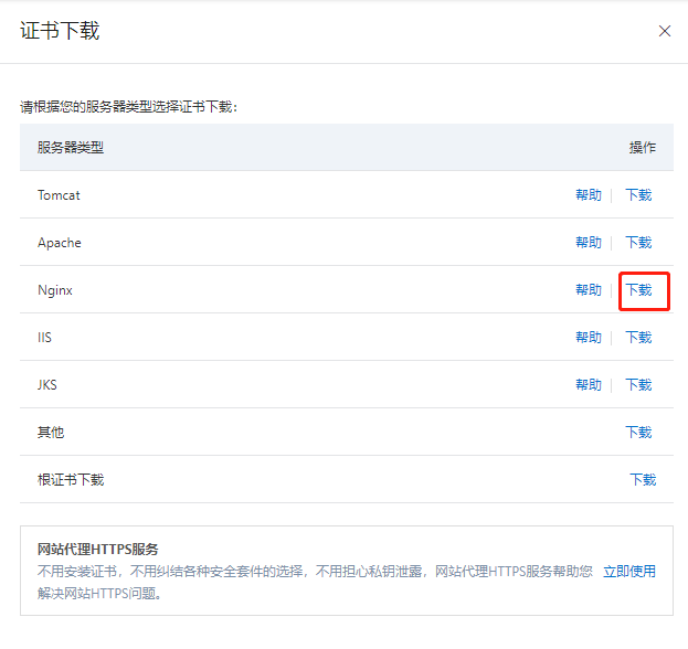 我這里是以Nginx作為反向代理,下載的證書類型是Nginx,所以前提是你的網站已經使用了Nginx
