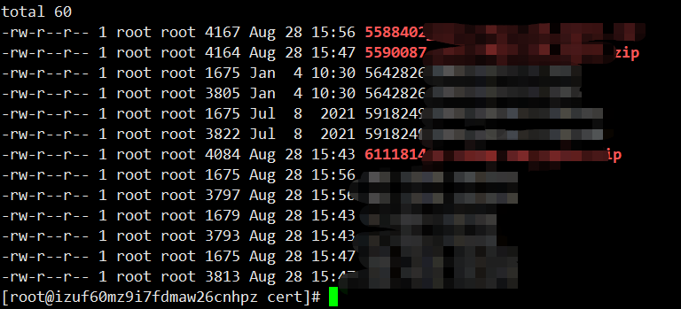 通過unzip命令解壓該文件,會得到兩個解壓文件,分別是以 .key和 .pem為后綴