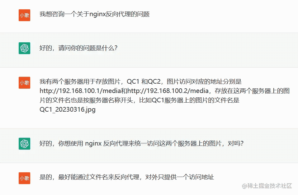 但是由于本人對 Nginx 配置不是很熟悉,剛好最近 ChatGPT 大紅大紫,于是萌生了詢問 ChatGPT 來解決這個問題的想法,于是就產生了下面我和 ChatGPT 的對話。
