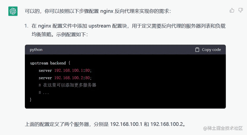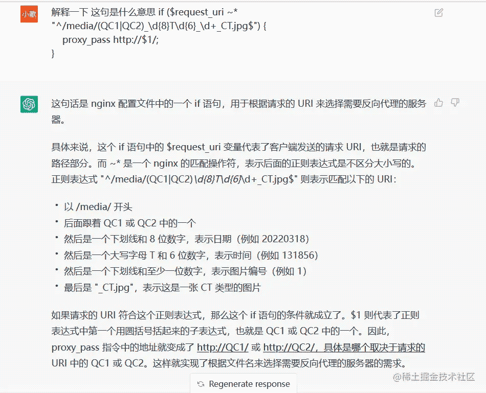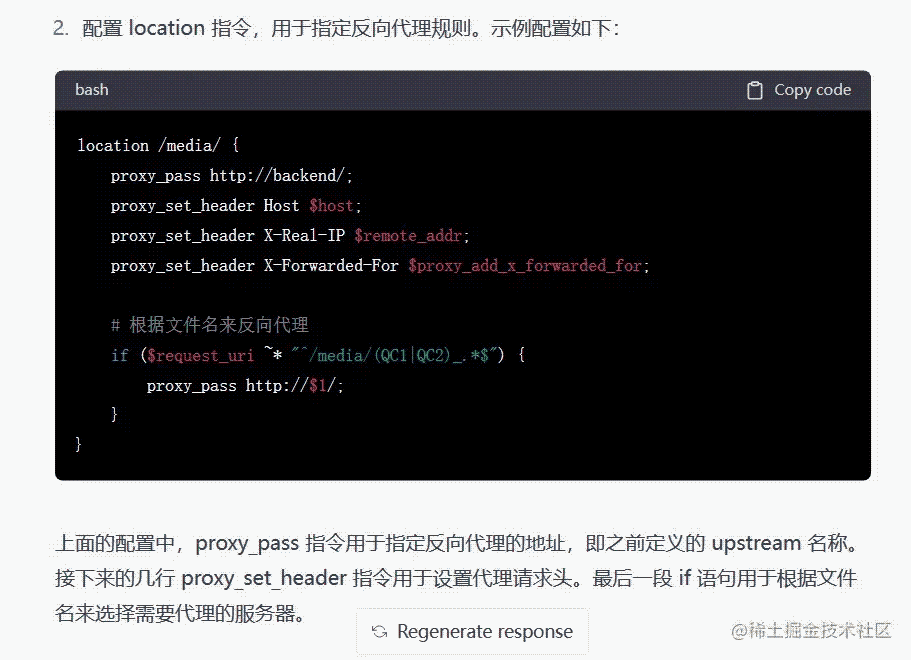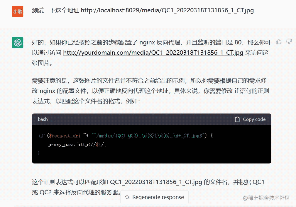 我向 ChatGPT 說明了我要咨詢關于 Nginx 反向代理的問題,并簡單介紹了背景。ChatGPT 很快就理解了我的問題,并提供了如下的 Nginx 配置