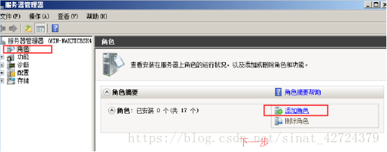 4. 進(jìn)入服務(wù)器管理器,點(diǎn)擊左側(cè)的“角色”然后點(diǎn)擊右側(cè)“添加角色”