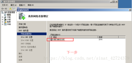 8. 進(jìn)入選擇網(wǎng)絡(luò)連接綁定,勾選IP地址;安裝程序?qū)⒆詣?dòng)檢查你的服務(wù)器是否具有一個(gè)靜態(tài)IP地址,第2步設(shè)置了則會(huì)被檢測(cè)顯示出來。