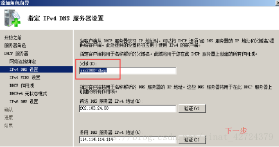 9. 接下來到“IPv4DNS設(shè)置”,需要輸入你的父域名和DNS服務(wù)器的IP地址,這個(gè)域?qū)⒂糜谖覀冊(cè)谶@臺(tái)DHCP服務(wù)器上創(chuàng)建的所有作用域; 當(dāng)DHCP更新IP地址信息的時(shí)候,相應(yīng)的DNS更新會(huì)將計(jì)算機(jī)的名稱到IP地址的關(guān)聯(lián)進(jìn)行同步。