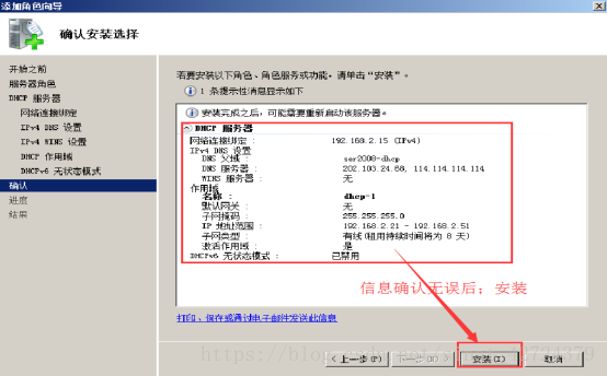 13. 在“確認(rèn)”界面,確認(rèn)后點(diǎn)擊安裝,開始自動(dòng)安裝。進(jìn)度條完成,DHCP也安裝完成。