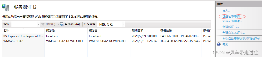 打開IIS,選中左側根節點,在右側”功能視圖“中,打開“服務器證書”,在最右側的“操作”窗口,點擊“創建證書申請…”,如下圖所示: