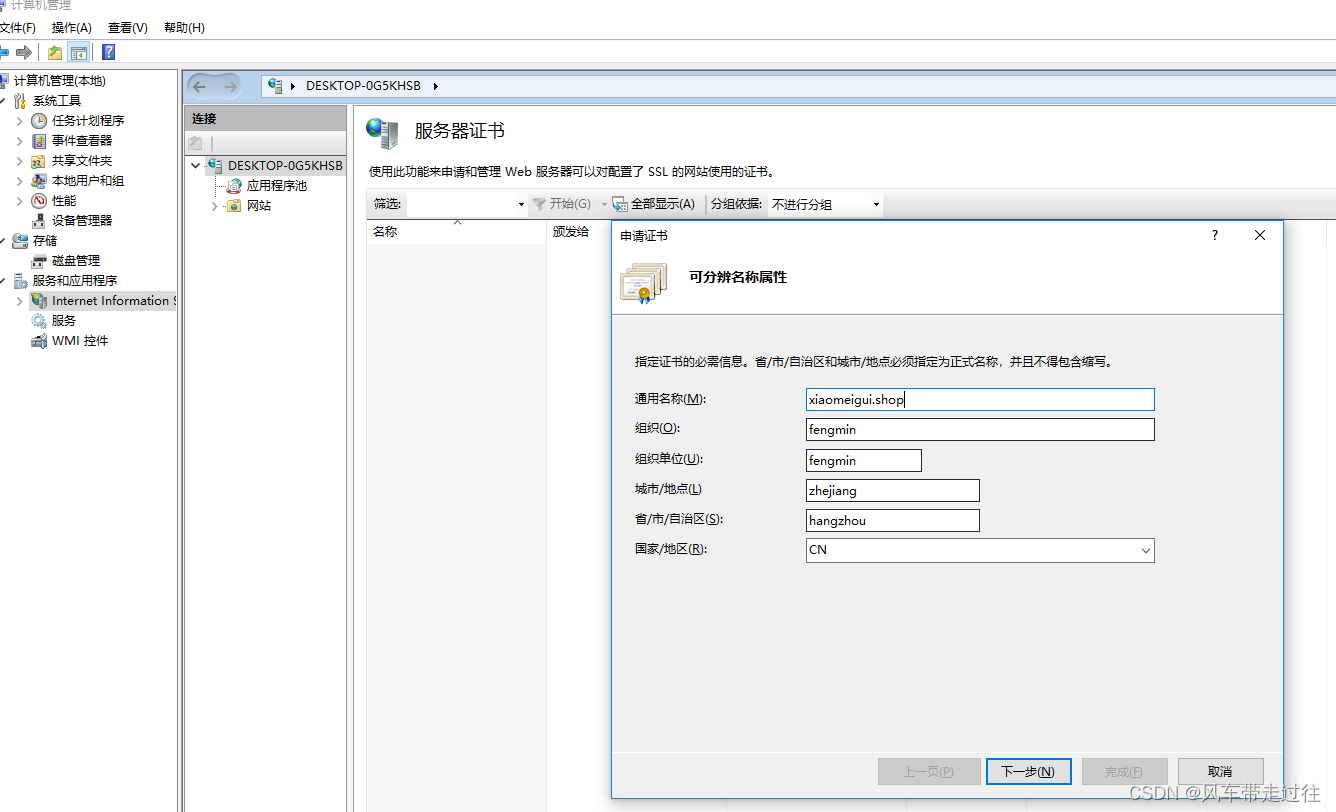 填寫CSR文件中的信息,通用名稱填寫要申請的域名,其他字段信息也請填寫正確,如下圖所示: