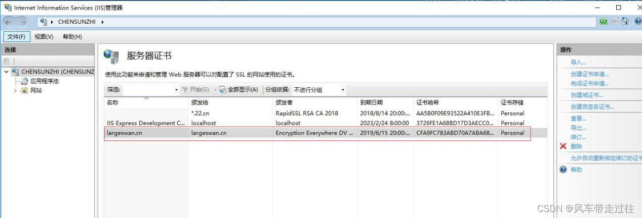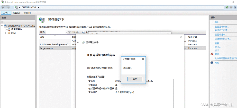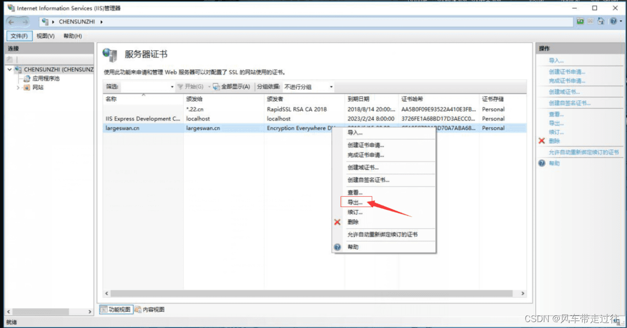 選中剛導入的證書,導出證書備份*.pfx.此文件可用作證書備份,及在其他機器中直接導入使用(在IIS中,選中左側根節點,在右側”功能視圖“中,打開“服務器證書”,在最右側的“操作”窗口,點擊”導入”,如果攜帶中級證書,其他機器先部署中級證書)。如下圖所示: