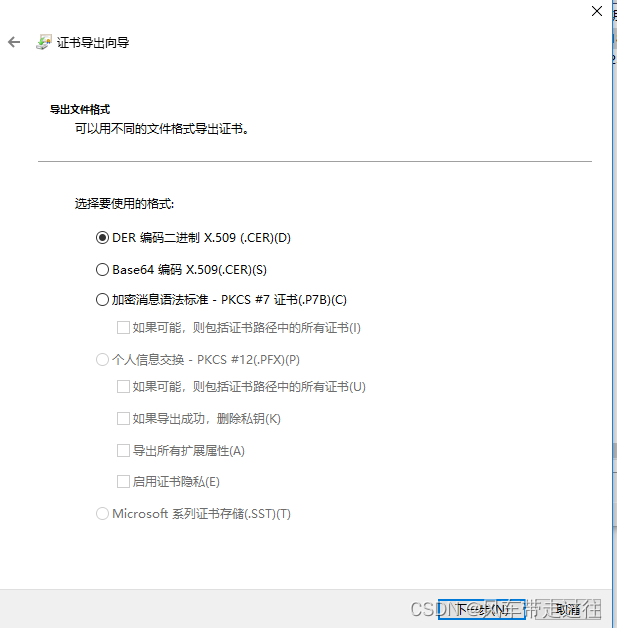 選擇“不,不要導出私鑰”即導出證書文件;