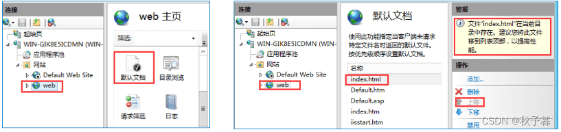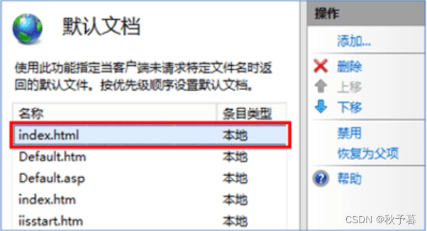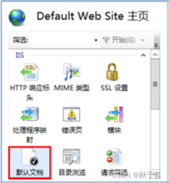 默認(rèn)文檔指的是當(dāng)客戶機(jī)訪問此網(wǎng)站目錄時(shí),IIS提供給瀏覽器的第一個(gè)文檔。大多數(shù)網(wǎng)站將 index.html 作為默認(rèn)文檔(俗稱首頁)。在Default Web Site主頁中,雙擊“默認(rèn)文檔“
