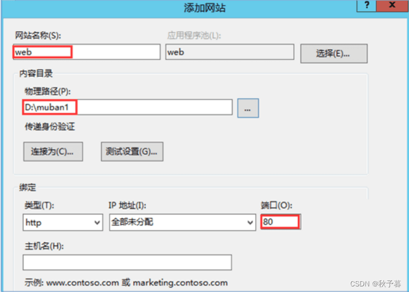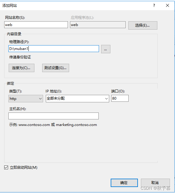 在彈出的“添加網(wǎng)站”對(duì)話框中,網(wǎng)站名輸web,“物理路徑”D:\muban1