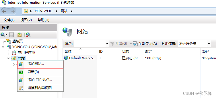 1)調(diào)整網(wǎng)頁目錄、在IIS管理器中,首選禁用默認(rèn)站點(diǎn),再右擊“網(wǎng)站”添加站點(diǎn)”