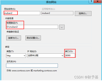 2)基于案例6再添加一個(gè)新的網(wǎng)站,站點(diǎn)名muban2,物理路徑D:\muban2,端口8090