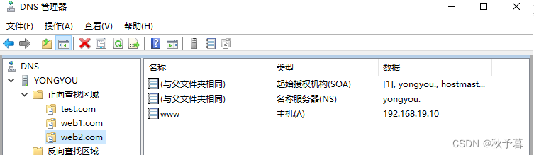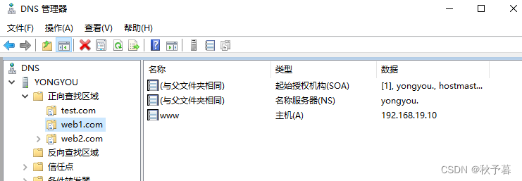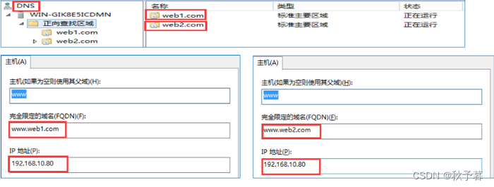 在DNS服務(wù)器上注冊(cè)兩個(gè)域名,都指向IIS服務(wù)器的地址www.web1.com的IP地址 192.168.10.80www.web2.com的IP地址 192.168.10.80