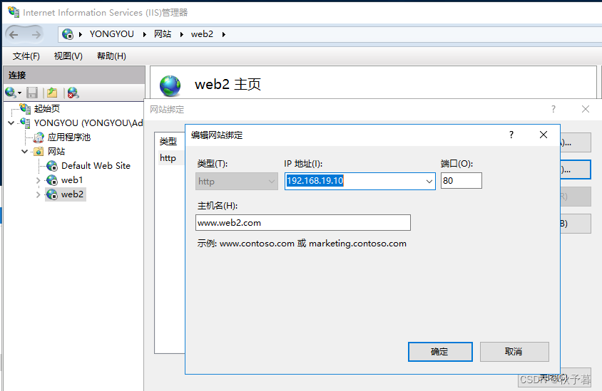 2)右擊網(wǎng)站添加網(wǎng)站,站點(diǎn)名為web2,物理路徑D:\web2,訪問IP地址192.168.19.10,端口號(hào)為80,主機(jī)名為www.web2.com