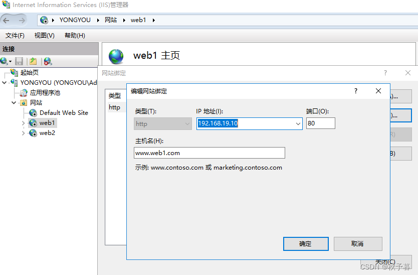 1)右擊網(wǎng)站添加網(wǎng)站,站點(diǎn)名為web1,物理路徑D:\web1,訪問IP地址192.168.19.10,端口號(hào)為80,主機(jī)名為www.web1.com