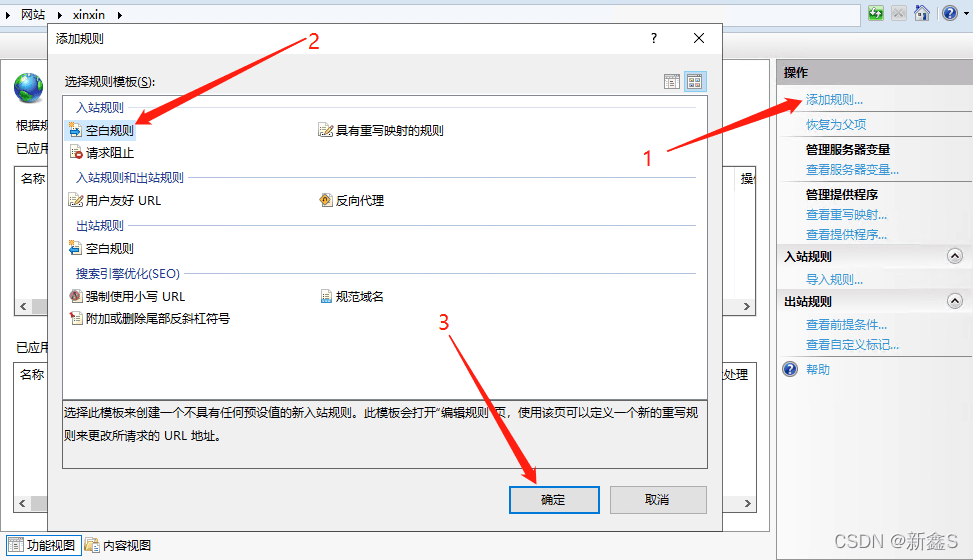 1.添加入站規則安裝完成后重新打開IIS,在部署的網站主頁會多出一個“URL重寫”的功能模塊,雙擊打開后依次點擊:添加規則——空白規則——確定(以下部分截圖來自網上)。