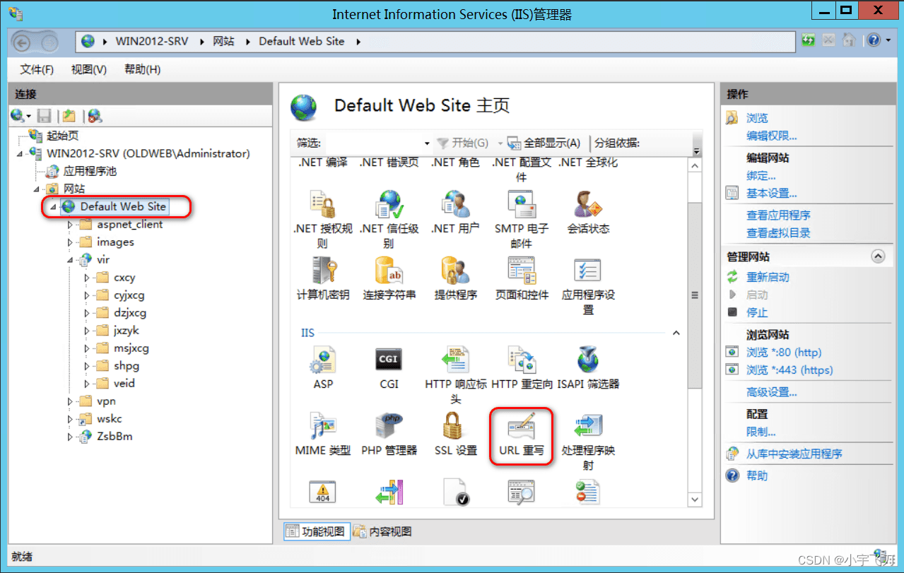 安裝完成后,退出IIS管理器并重新打開它,在網站主頁上會發現多了一個“URL重寫”模塊: